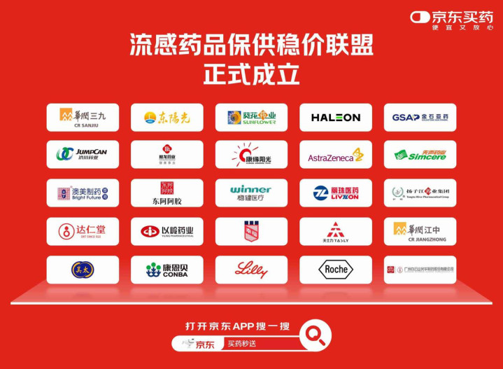 针对这一情况,京东买药秒送迅速响应,联合华润三九、东阳光药业、葵花药业等25家国内外知名医药健康企业和品牌,正式成立“流感药品保供稳价联盟”,旨在通过产业协同,确保流感相关药品及防护用品的充足供应与价格稳定,全力守护民众平稳度过此轮流感。